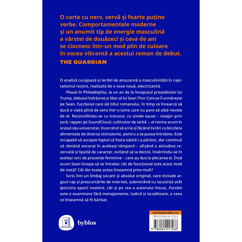„Fuccboi” de Sean Thor Conroe este un roman scris într-un stil experimental, direct și neconvențional, care urmărește gândurile, trăirile și contradicțiile unui tânăr scriitor în luptă cu identitatea sa, masculinitatea, relațiile și sensul propriei existențe. Limbajul colocvial, ritmul fragmentat și vocea narativă autentică oferă o privire intimă și provocatoare asupra unei generații în derivă.