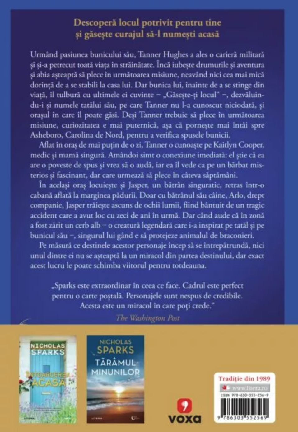 În căutarea unui miracol este un roman sensibil în care Nicholas Sparks explorează tema apartenenței și a căutării unui loc pe care să-l numești „acasă”. Tanner Hughes, crescut de bunicii săi, a urmat tradiția familiei și a intrat în armată, trăind o viață plină de drumuri și misiuni. Chiar înainte să moară, bunica lui îi dezvăluie numele tatălui pe care nu l-a cunoscut niciodată, alături de o ultimă dorință: să-și găsească locul în lume. Împins de curiozitate, Tanner ajunge în Asheboro, Carolina de Nord, unde întâlnește oameni care îi vor schimba definitiv perspectiva asupra vieții.