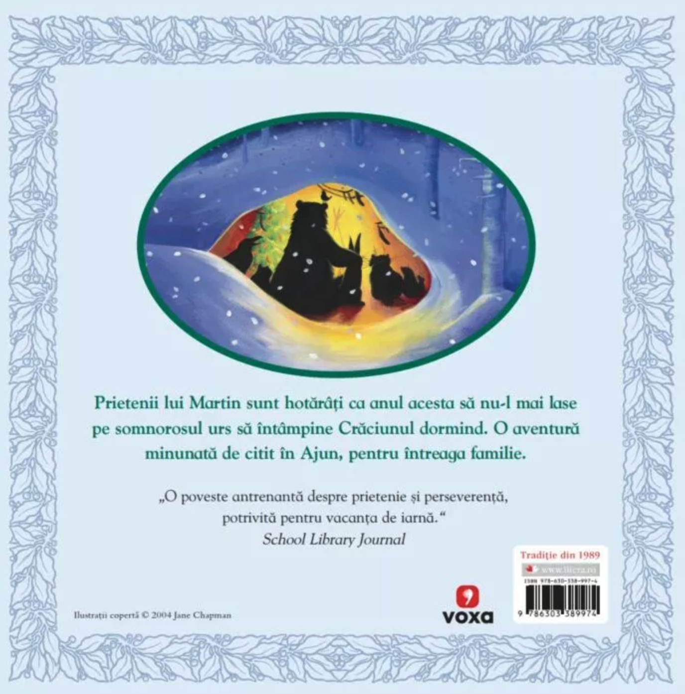 Prietenii lui Martin sunt deciși ca, în sfârșit, ursul cel somnoros să nu mai rateze Crăciunul. Toți se mobilizează ca să-l țină treaz și să îi arate magia sărbătorilor, chiar dacă Martin abia își poate ține ochii deschiși. Este o poveste caldă și amuzantă despre prietenie, perseverență și bucuria de a fi împreună, perfectă pentru citit în Ajun în familie.