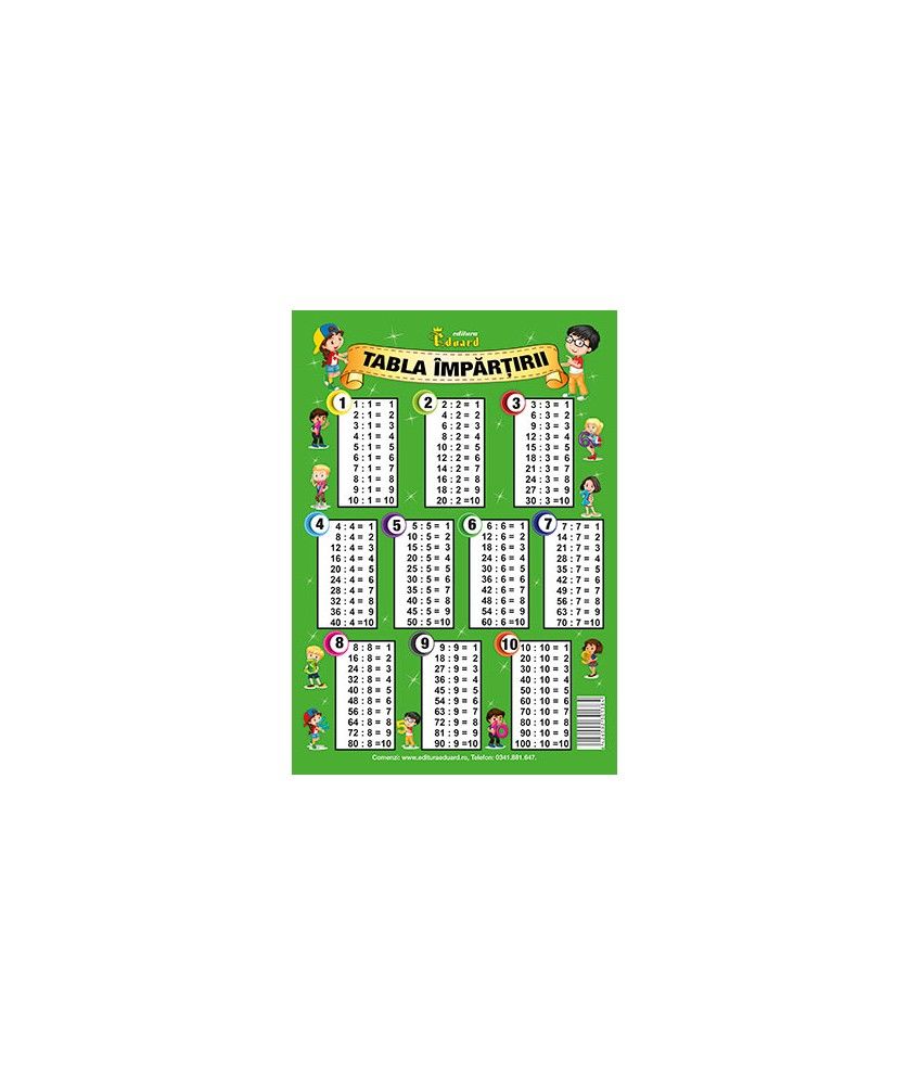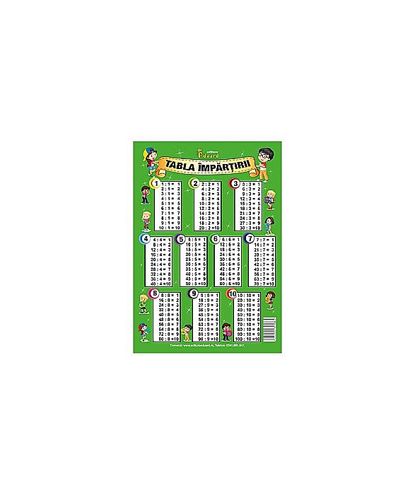Plansa tabla impartirii format A4, ilustrata color, de la 1 la 10.