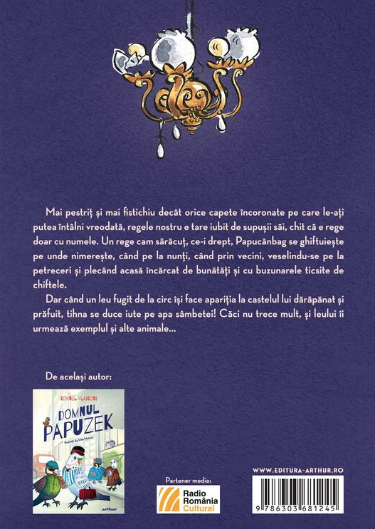 O poveste plină de umor despre un rege neobișnuit și aventurile sale neașteptate. Papucănbag, rege doar cu numele, duce o viață veselă până când un leu fugit de la circ îi dă planurile peste cap. O carte savuroasă pentru copii, ilustrată cu farmec și imaginație.