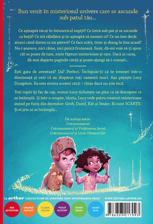 Scartii spune povestea orasului Whiffington, unde toti adultii dispar peste noapte, iar copiii se trezesc intr-o lume fara reguli, teme sau obligatii. La inceput, libertatea pare perfecta, insa Lucy Dungston, eroina cartii, isi da seama ca lucrurile nu pot functiona fara grija si intelepciunea celor mari. Pornind intr-o aventura plina de pericole si descoperiri, Lucy afla ca disparitia parintilor este legata de Scartii, creaturi ciudate care traiesc sub pat si care privesc lumea dintr-o perspectiva completa diferita.