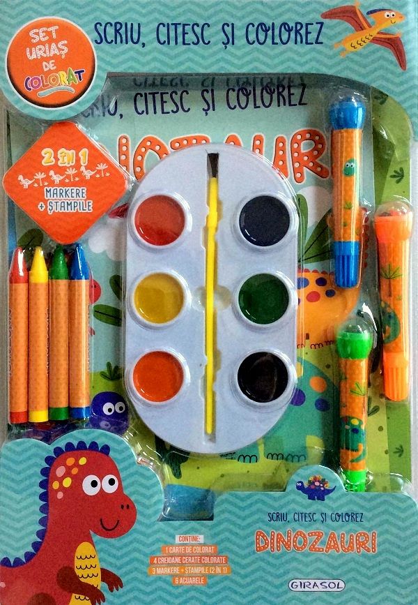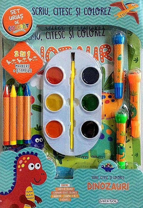 Un set urias de colorat pentru cei mai mici, imaginile sunt simple, mari si desenate cu un contur gros, asa cum le place copiilor. Fiecare carte contine 4 creioane cerate + 3 markere + stampile (2 in 1) + 6 acuarele.