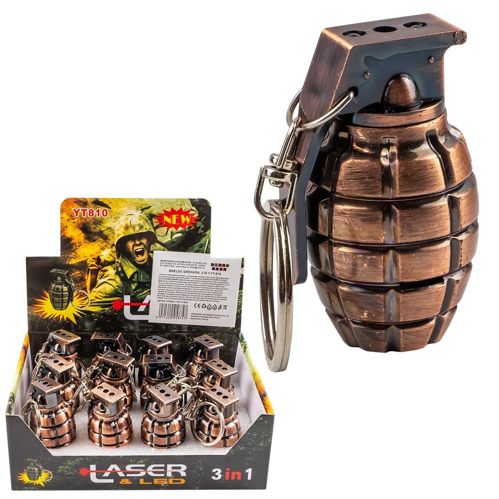 - Brelocul cu design de grenada este mic si rafinat, portabil si cu aplicatie 3 in 1, avand functie de jucarie, indicator laser rosu si blit luminos. Brelocul este construit practic, indicatorul laser fiind potrivit pentru prezentari sau pentru a indica diferite locuri sau obiecte aflate la distanta. De asemenea, laserul este extrem de distractiv pentru pisicile jucause. Brelocul, avand functie de blit, este folositor in conditii de lasare a serii sau pe timp de noapte pentru a trimite semnale luminoase. Declansarea luminii si a laserului se face prin apasarea celor doua butoane de pe corpul laserului.