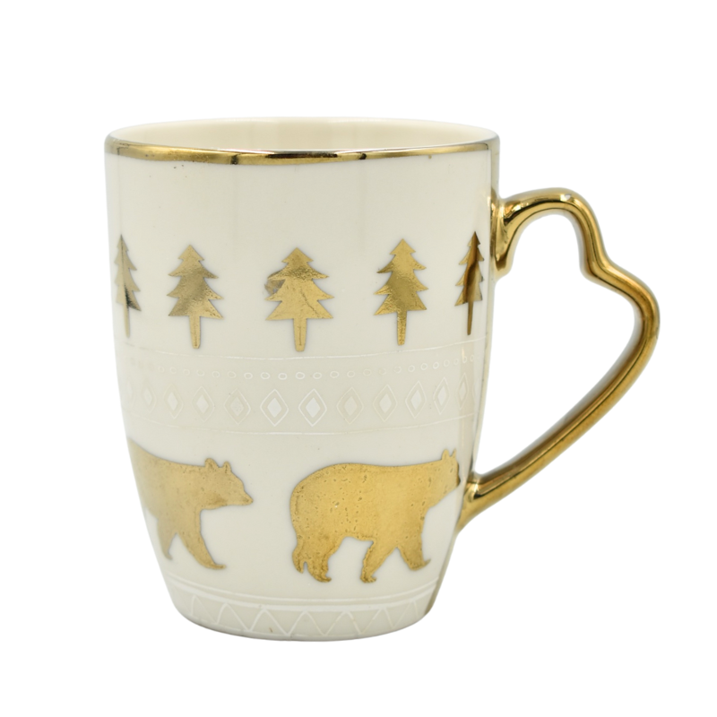Bucură-te de momentele de relaxare cu această cană ceramică de 300 ml, realizată într-un design sofisticat alb cu accente aurii. Decorată cu motive inspirate din natură – brazi și urși stilizați – și finisată cu o margine și un mâner auriu în formă de inimă, cana aduce un farmec aparte oricărei mese.
