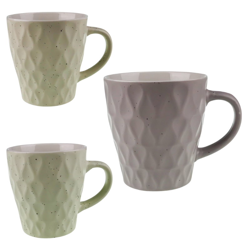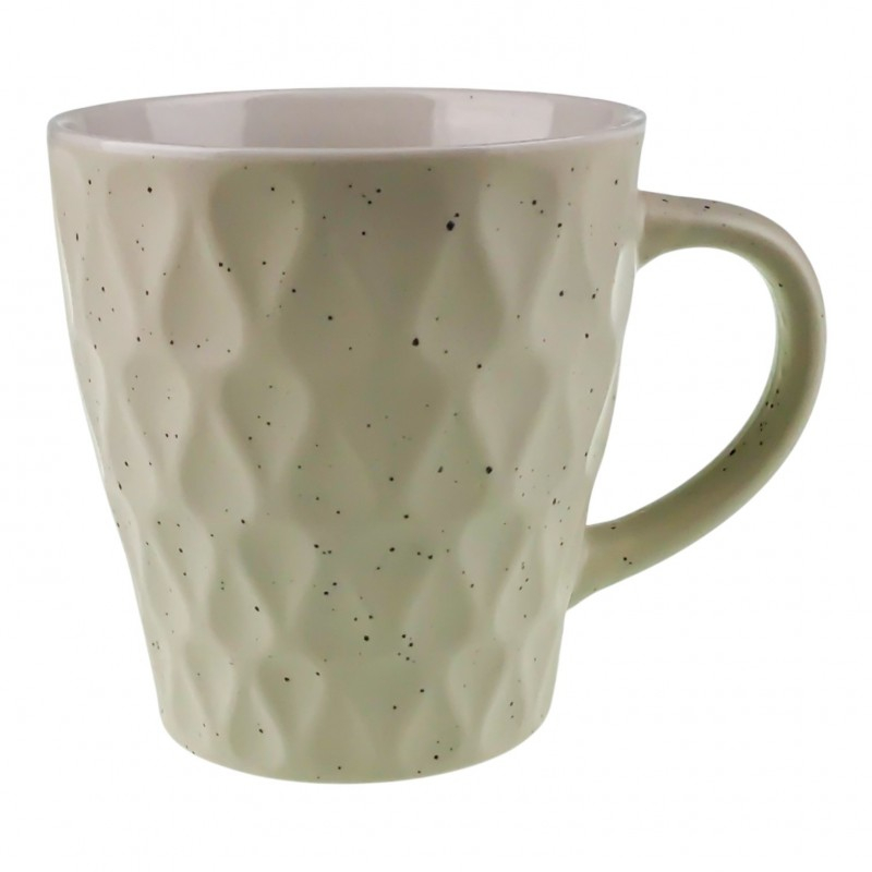 Această cană din ceramică are un design modern, cu model în relief tip romburi și puncte negre discrete. Este disponibilă în trei variante de culoare: gri, verde mentă și bej. Potrivită pentru cafea, ceai sau alte băuturi calde, oferă un plus de stil fiecărei utilizări.