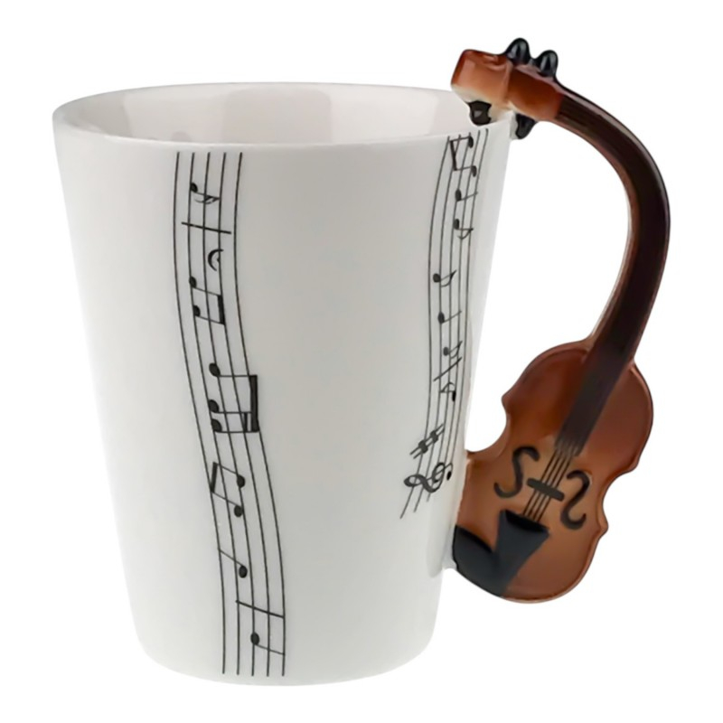 Această cană ceramică se remarcă prin designul său artistic, decorat cu note muzicale și un mâner original în formă de vioară. Este ideală pentru cafea, ceai sau alte băuturi calde, aducând un plus de eleganță și creativitate fiecărei pauze. Perfectă pentru iubitorii de muzică clasică.