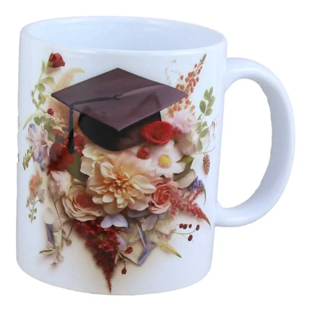Această cană din ceramică este creată pentru a marca un moment important din viață – absolvirea. Decorul delicat, cu aranjament floral și tocă de absolvent, transmite eleganță și emoție, fiind simbolul succesului și al unui nou capitol.