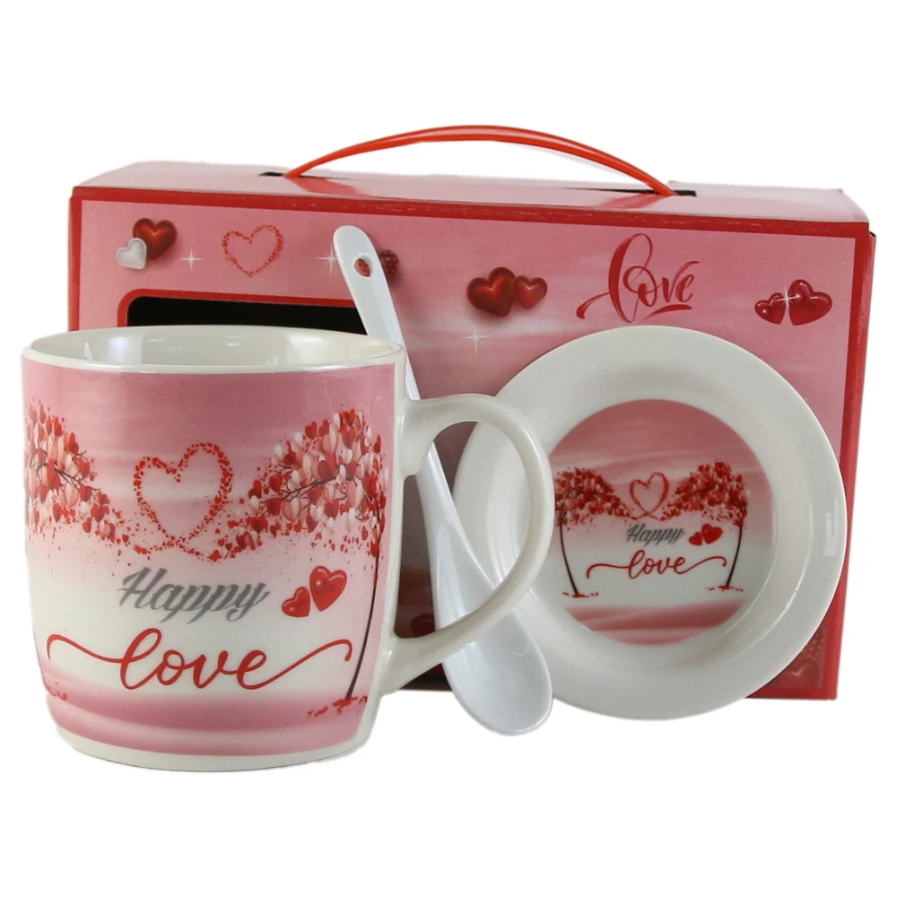 Mesajul „Happy Love” și elementele grafice romantice creează un aspect plăcut și optimist, potrivit pentru dimineți liniștite sau pauze de răsfăț.