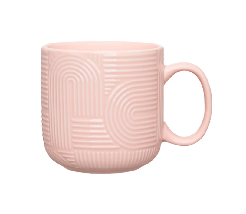 Cană din porțelan în nuanță delicată de roz, cu design geometric în relief. Are o capacitate de 390 ml și un mâner confortabil, ușor de utilizat. Potrivită pentru cafea, ceai sau alte băuturi calde, în orice moment al zilei.