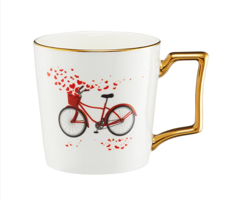 Cană elegantă din porțelan, decorată cu o bicicletă roșie și inimioare, cu accente romantice. Are o capacitate de 430 ml și un mâner geometric auriu care oferă un aspect rafinat. Ideală pentru cafea, ceai sau ciocolată caldă, acasă sau la birou.