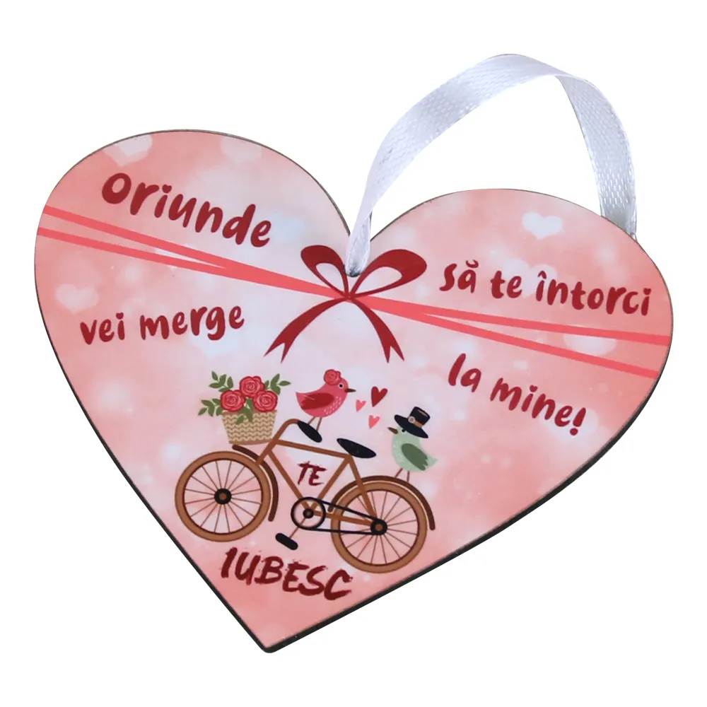 Decor romantic în formă de inimă, realizat din lemn, cu un mesaj plin de emoție și un design delicat. Ideal pentru a transmite un gând frumos unei persoane dragi. Se potrivește perfect ca mic cadou simbolic sau element decorativ.