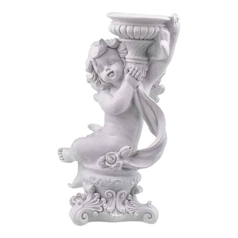 Decorațiunea este realizată din rășină și împreuna într-o postură grațioasă, susținând o mică ornamentală, bogată decorată cu elemente florale și forme clasice. Finisajul atent evidențiază expresia blândă a îngerului și detaliile sculpturale ale bazei. Cu o înălțime de aproximativ 21 cm și o lățime de 12 cm, piesa are dimensiuni potrivite pentru a fi așezată pe o etajară, comodă sau masă decorativă. Este o alegere inspirată pentru decorarea locuinței sau ca obiect simbolic oferit cadou, aducând un plus de eleganță și armonie în orice ambient.