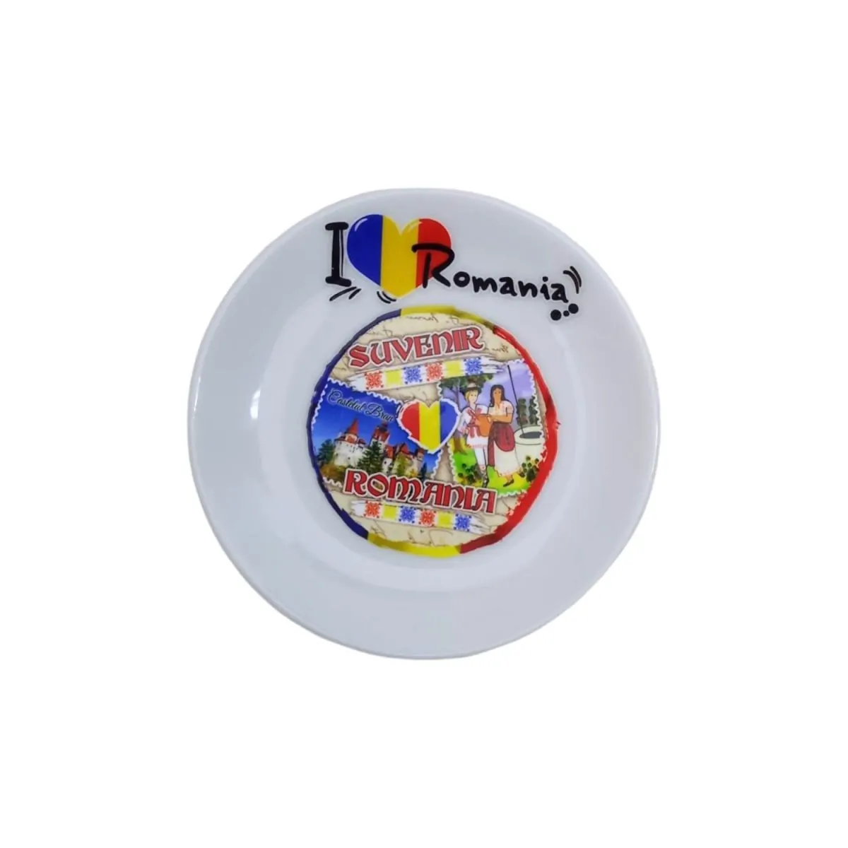 Farfuria mică suvenir 5 este realizată din ceramică de calitate, cu finisaje rezistente și detalii decorative inspirate din motive tradiționale și simboluri ale României. Având diametrul de 10 cm, este o piesă elegantă și practică, ideală pentru colecționari sau pentru a fi oferită cadou celor dragi.
