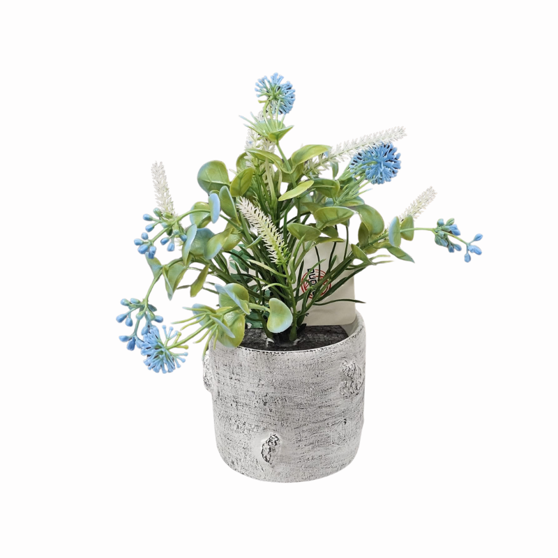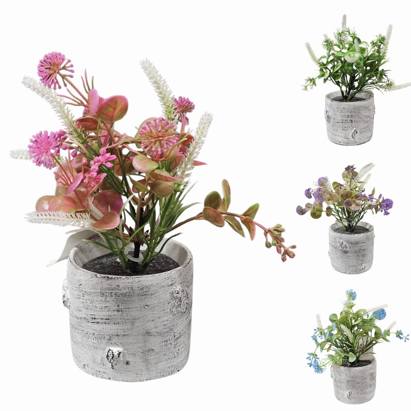 Aranjamentul floral este compus dintr-o varietate de plante artificiale de calitate, cu detalii realiste care imită aspectul florilor de câmp și al verdeții proaspete. Poți alege modelul care se potrivește cel mai bine cromaticii camerei tale, setul fiind disponibil în nuanțe captivante: un roz romantic, un mov elegant, un albastru senin sau un alb pur cu accente verzi. Fiecare variantă este îmbogățită cu elemente de vegetație fină, de culoare albă, care adaugă volum și contrast întregii compoziții, creând o imagine vizuală echilibrată și plăcută.
