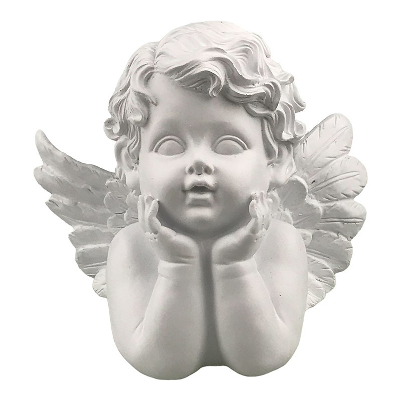 Decorațiunea din rășină îl zone pe un înger cu mâinile sprijinite sub bărbie, într-o postură calmă și expresivă. Designul transmite liniște și delicatețe, fiind potrivit pentru decor interior. Este ideal ca obiect decorativ sau cadou simbolic.