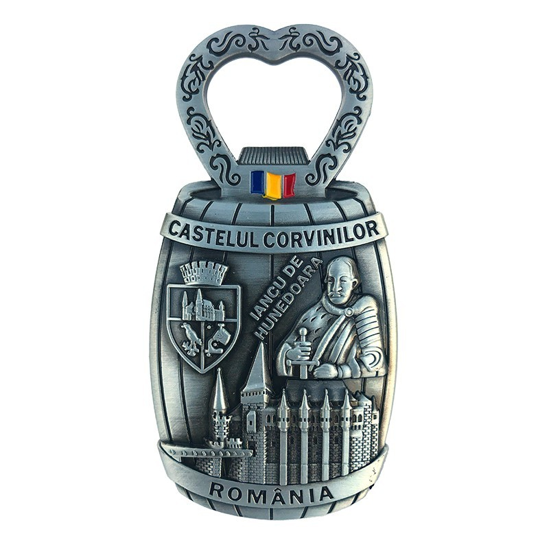 Acest desfacător magnetic pentru sticle îmbină frumusețea unui suvenir autentic cu funcționalitatea unui obiect practic. Confecționat din metal rezistent, are forma unui butoi și este decorat cu detalii în relief reprezentând Castelul Corvinilor din Hunedoara și figura lui Iancu de Hunedoara, simboluri importante ale istoriei României.