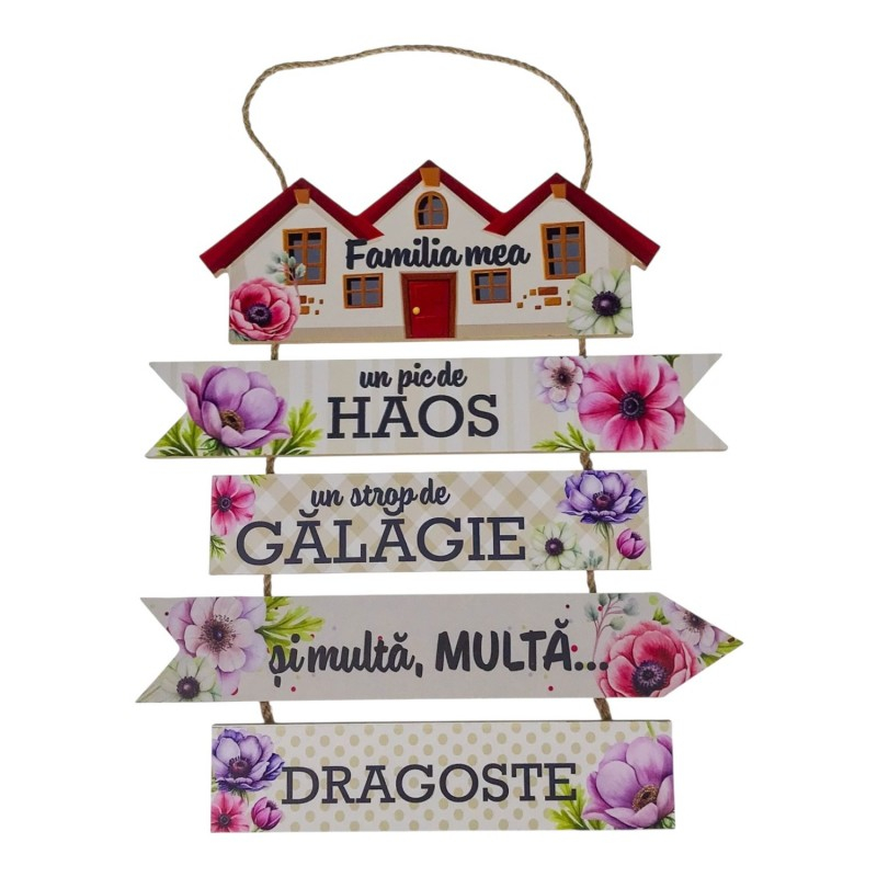 Textul „Familia mea, un pic de haos, un strop de gălăgie, nimultă, multă… dragoste” adaugă o notă sinceră și plină de umor, perfectă pentru orice cămin.