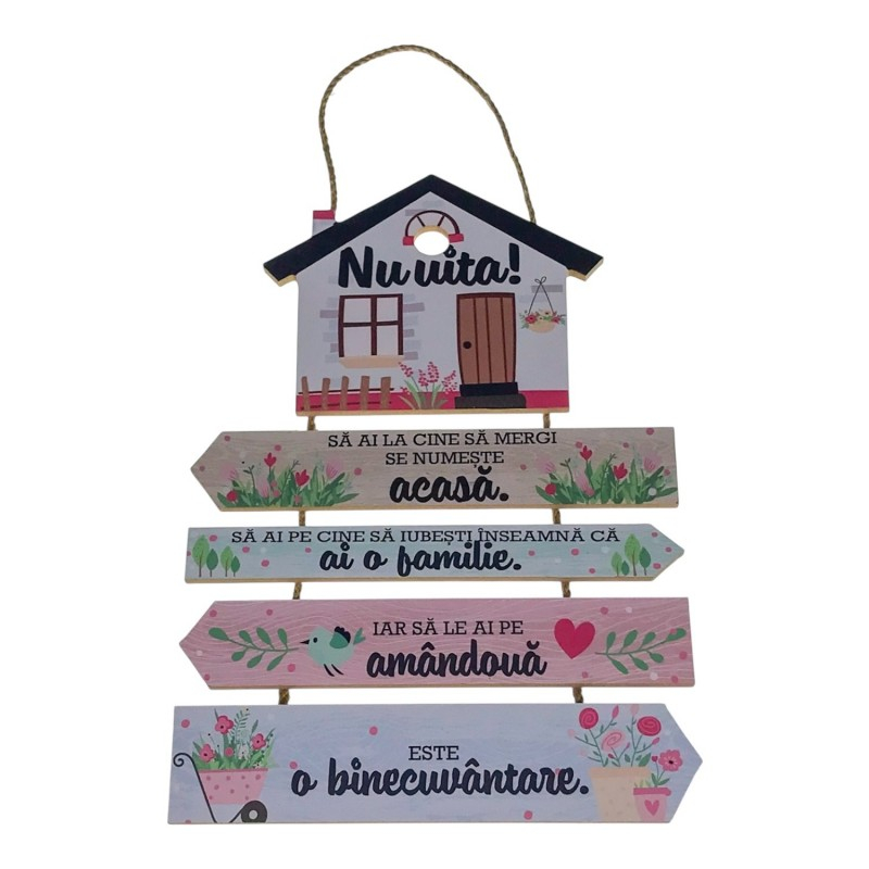 Plachetă decorativă din lemn, în formă de casă, cu mesajul „Nu uită”, potrivită pentru a adăuga sau notă caldă și personală oricărui spațiu. Designul simplu și mesajul sugestiv o fac ușor de integrat în diferite tipuri de decor. Este ideală ca mic accent decorativ sau cadou cu semnificație.