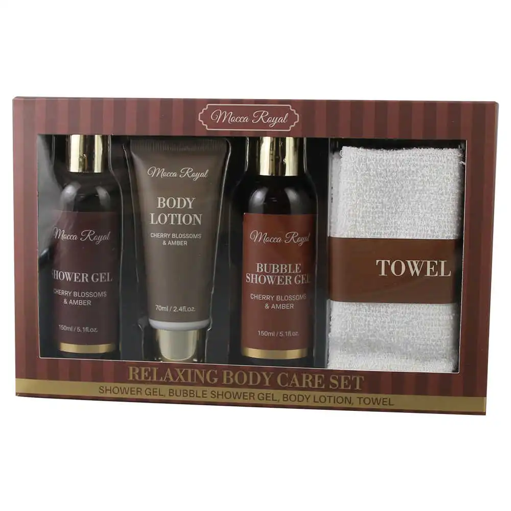 Acest set de baie Mocca Royal cu 4 piese este alegerea ideală pentru o experiență completă de îngrijire și relaxare. Parfumul rafinat de cherry blossoms și amber îți oferă o senzație plăcută și reconfortantă, transformând fiecare rutină de îngrijire într-un moment special.