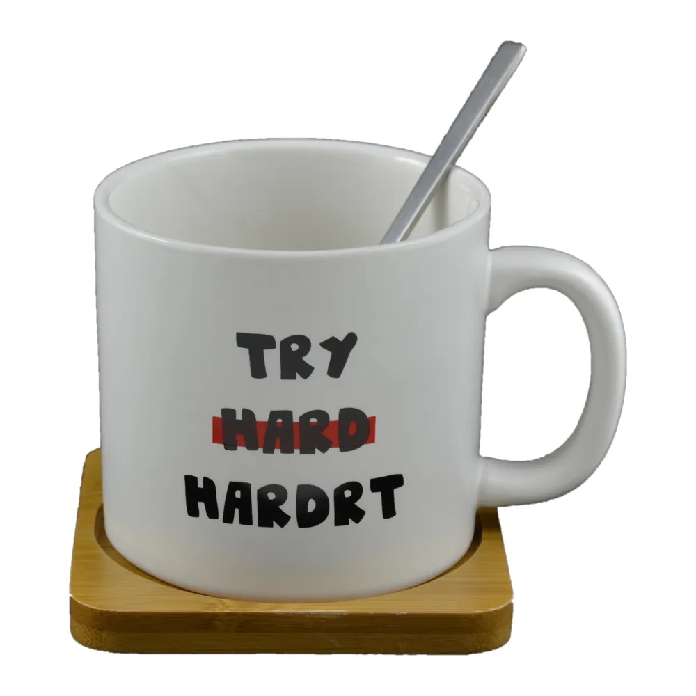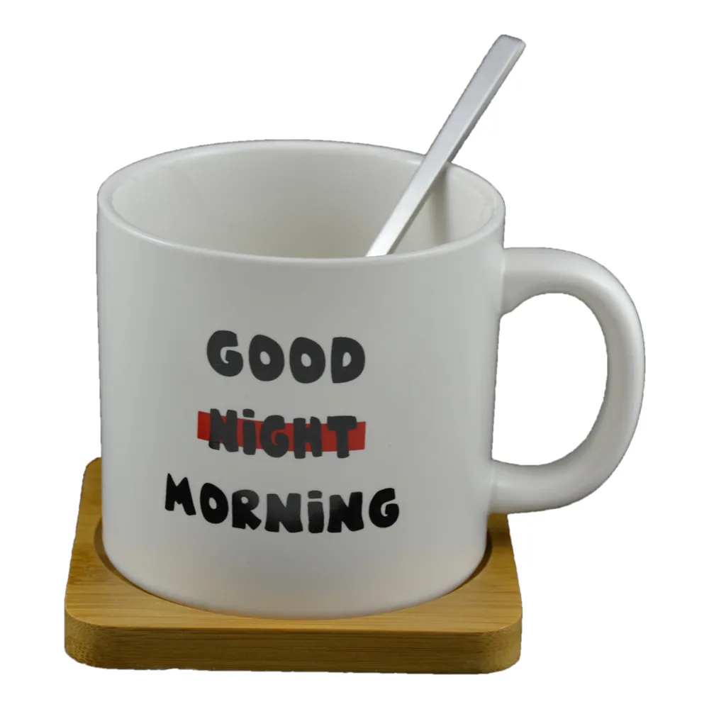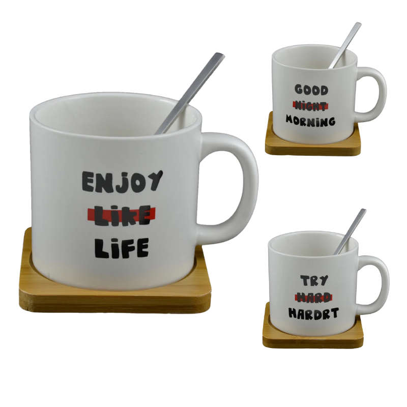 Setul este format dintr-o ceașcă, o linguriță și un suport având un design cu mesaje inscripționate. Este potrivit pentru servirea băuturilor calde în momentele de relaxare. Aspectul modern îl face potrivit atât pentru uz personal, cât și pentru cadou.