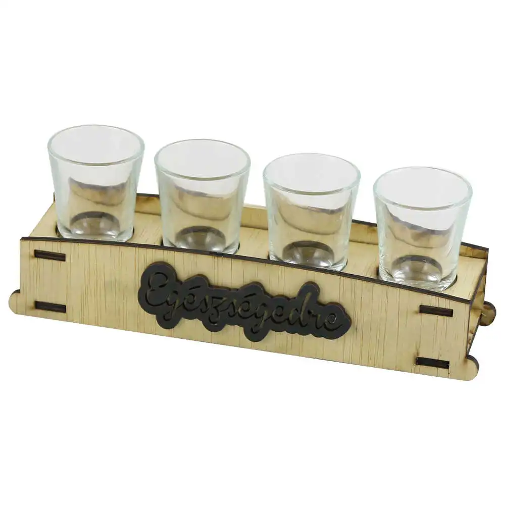 Acest suport din lemn cu 4 pahare este un accesoriu perfect pentru servirea băuturilor într-un mod organizat și plăcut vizual. Designul natural al suportului este completat de inscripția „Egészségedre”, care înseamnă „Noroc”, aducând un plus de autenticitate și originalitate setului.