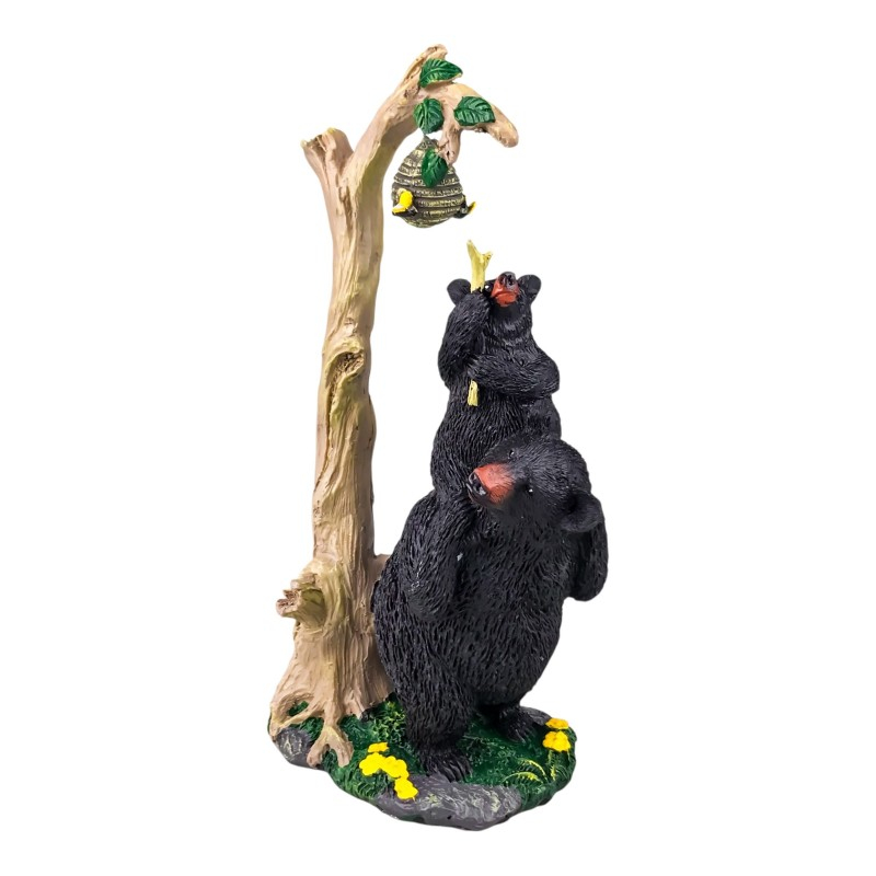 Decorațiunea „Urs cu fagure de miere” este realizată din rășină și redă cu multă atenție la detaliile o scenă plină de viață, în care o familie de urși interacționează într-un cadru inspirat din natură. Textura blănii, forma copacului și fagurele suspendate creează o compoziție echilibrată și plăcută vizuală, care transmite căldură și un strop de poveste.