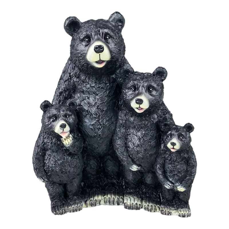 Această figurină din rășină ilustrează un urs adult alături de puii săi, într-o compoziție echilibrată și plină de emoție.