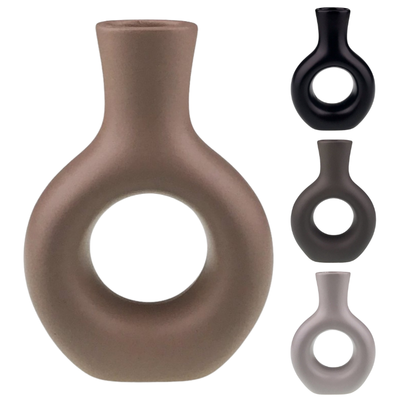 Vaza decorativă din ceramică cu gât subțire și cerc la mijloc este realizată într-un stil modern, cu linii fluide și proporții echilibrate. Decupajul circular adaugă profunzime și un efect vizual deosebit, transformând vaza într-o piesă artistică. Finisajul mat, în nuanțe neutre, permite integrarea ușoară în diferite stiluri de decor interior.