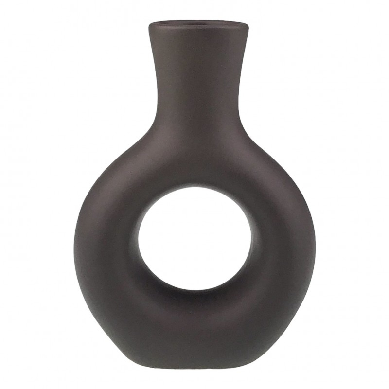 Această vază decorativă din ceramică impresionează prin designul său modern, cu gât subțire și decupaj circular în zona centrală. Forma sa elegantă o transformă într-un obiect decorativ de impact. Este ideală pentru amenajări contemporane și minimaliste.