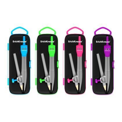 Compas cu creion. Raza maxima este de 18,5 cm. Suportul universal permite utilizarea pentru desenarea diferitelor accesorii de scris. Prezentat în culori strălucitoare neon.