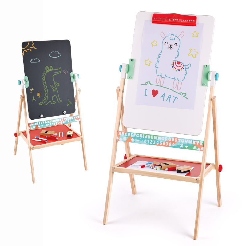 Acest sevalet pliabil cu doua fete este ideal pentru desen, scris si joaca creativa. Copilul poate alege intre tabla neagra pentru creta si tabla alba pentru marcare, in functie de activitate dorita. Designul pliabil il face usor de depozitat si perfect pentru orice spatiu.