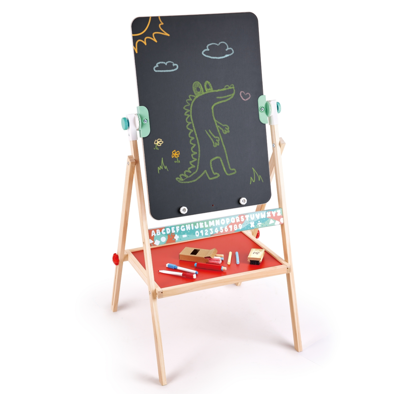 Sevaletul este independent si stabil, realizat din lemn, cu margini rotunjite si finisaje sigure pentru cei mici. Include accesorii utile pentru joaca si invatare, precum crete colorate, markere, suport pentru creta si burete de sters. In partea inferioara dispune de o tava practica pentru depozitarea accesoriilor, astfel incat totul sa fie mereu la indemana.