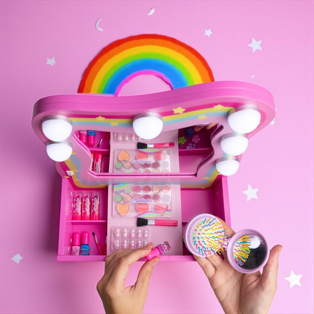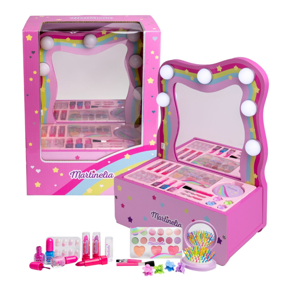 Transformă fiecare zi într-un moment special cu măsuța de machiaj cu produse cosmetice Martinelia, un set complet care îmbină distracția, creativitatea și eleganța. Designul roz, decorat cu curcubeu și steluțe, alături de oglinda cu lumini integrate, creează un colț de frumusețe perfect pentru micile fashioniste.