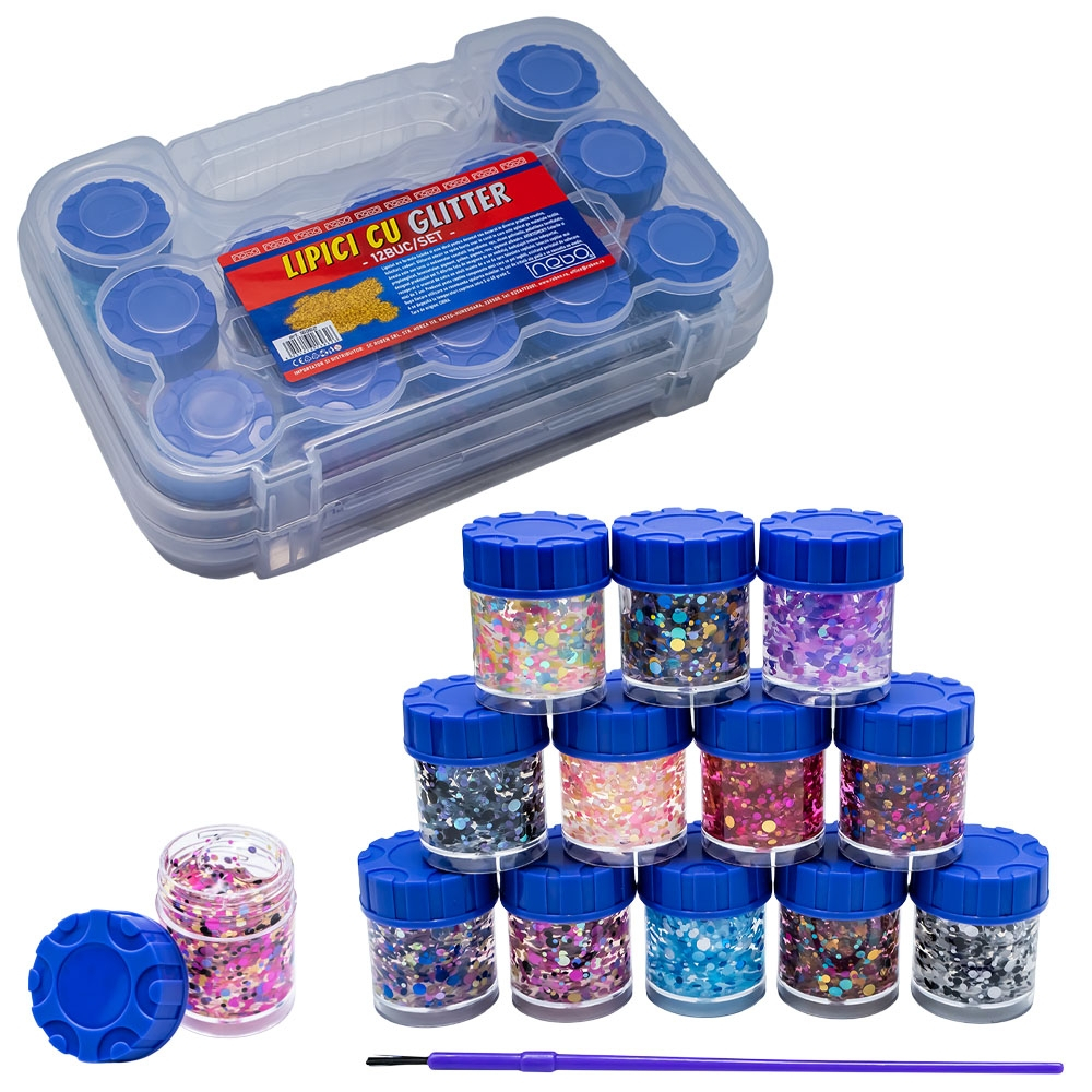 Lipiciul cu glitter este non-toxic și sigur pentru copii, iar în cazul contactului cu materiale textile se curăță rapid cu apă. Sclipiciul sunt combinații variate de culori, oferind un plus de strălucire desenelor, felicitărilor, cadourilor și creațiilor handmade. Pensula inclusă are mâner din plastic și vârf drept din fibre sintetice, pentru o aplicare uniformă.