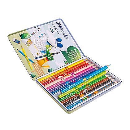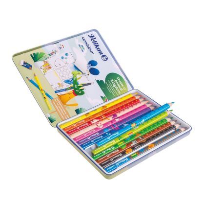 Set de creioane combino in cutie de metal. Contine un creion grafit invata-sa-scrii si un set de creioane colorate combino, 12 culori, corp lacuit, gros, ergonomic, sectiune triunghiulara, din lemn certificat 100% FSC, mina 4 mm. Ambalajul este reutilizabil ca si cutie sau suport pentru creioanele colorate. Modelele de animale, prezente pe creioane, pot fi combinate si potrivite in orice fel, pentru a imagina noi creaturi fantastice nemaivazute in regatul animalelor. Sectiunea ergonomica, triunghiulara, ofera sprijin optim copiilor pentru invatarea scrisului si ii incurajeaza sa tina corect creionul pentru a scrie. Desenul este una dintre etapele ce preced invatarea scrisului, dar si primul pas al copiilor spre invatarea si stapanirea functiilor motorii avansate. Copiii pot folosi creioanele colorate combino pentru a invata prin joaca, amestecand sau potrivind motivele cu animale.
