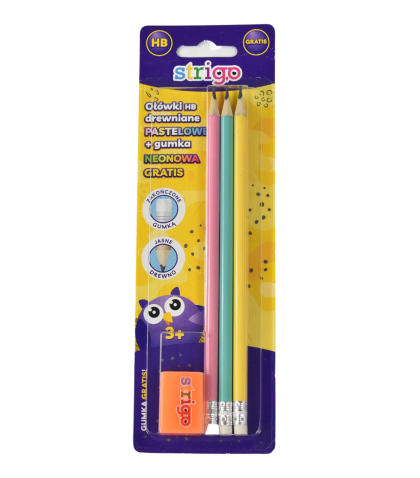Set de 3 creioane HB pastel din lemn+guma de sters neon gratuit