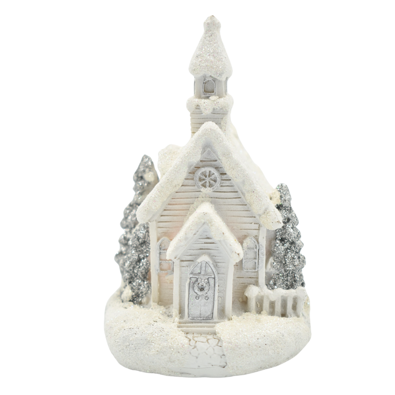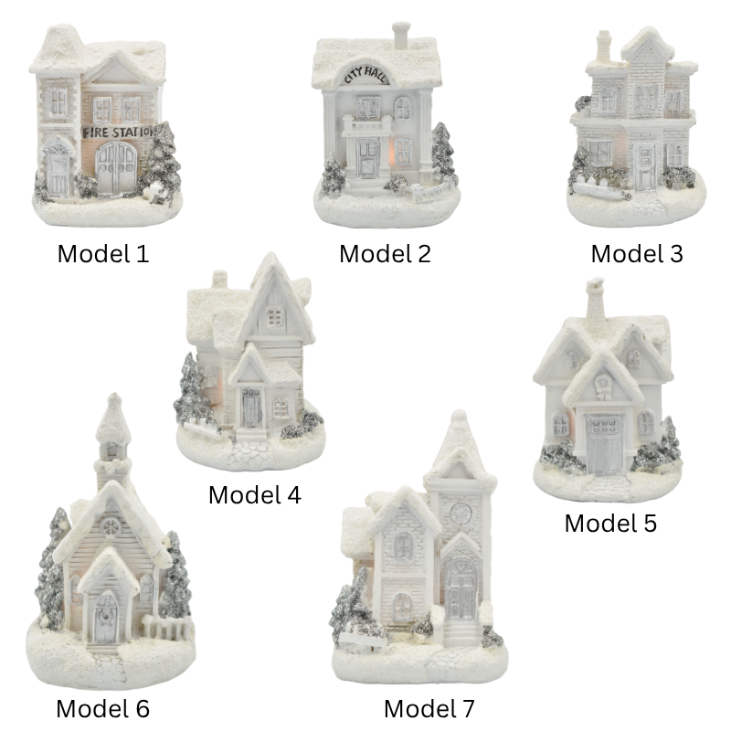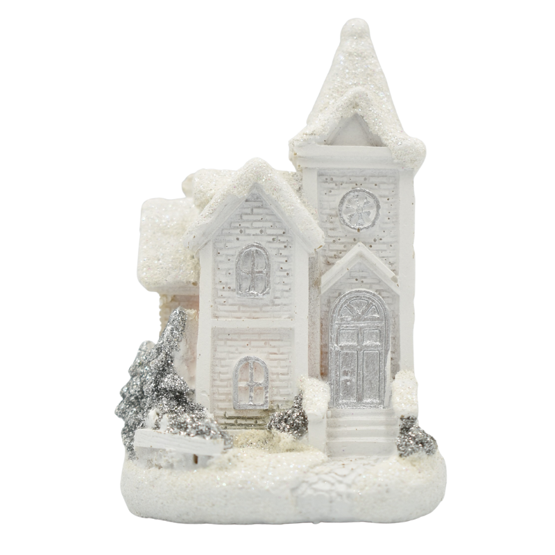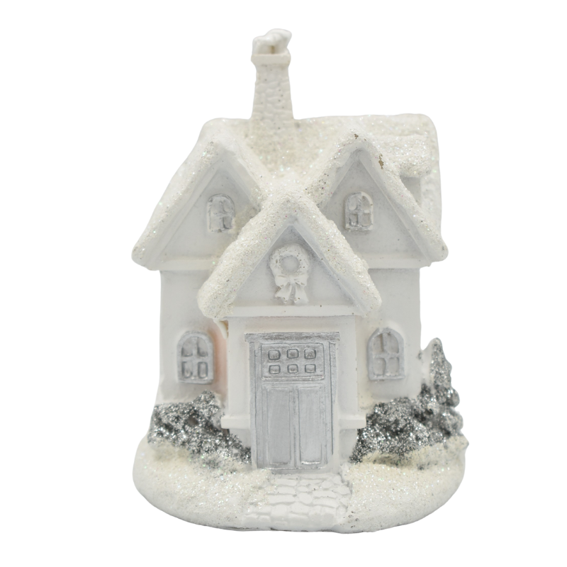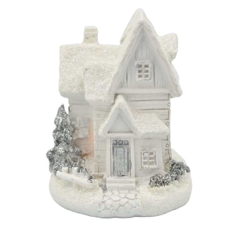 Adaugă farmec și lumină decorului tău de sărbători cu căsuța de iarnă cu LED din rășină, în nuanțe elegante de alb și argintiu. Miniatura decorativă creează o atmosferă caldă și festivă în orice colț al casei.