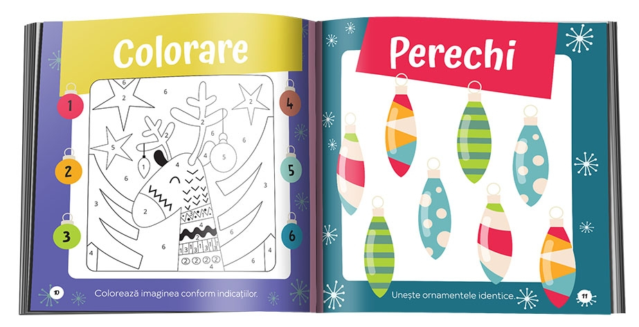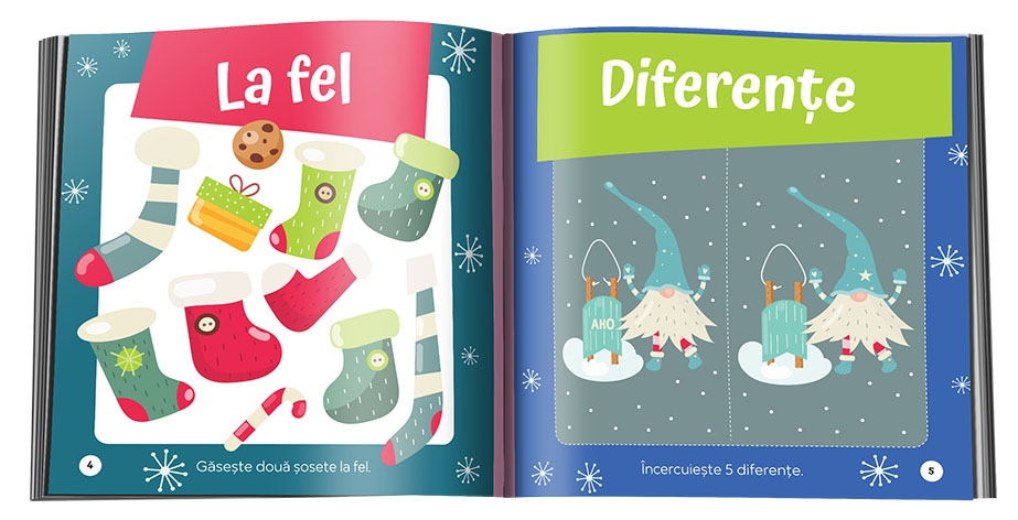 Cartea include activități variate, precum găsirea perechilor, descoperirea diferențelor dintre imagini, potrivirea umbrelor potrivite și rezolvarea unor careuri de cuvinte pe înțelesul copiilor. Fiecare pagină este ilustrată într-un stil vesel și prietenos, cu personaje specifice sărbătorilor – reni, spiriduși, oameni de zăpadă și brăduți împodobiți – care transformă exercițiile într-o aventură plină de zâmbete.