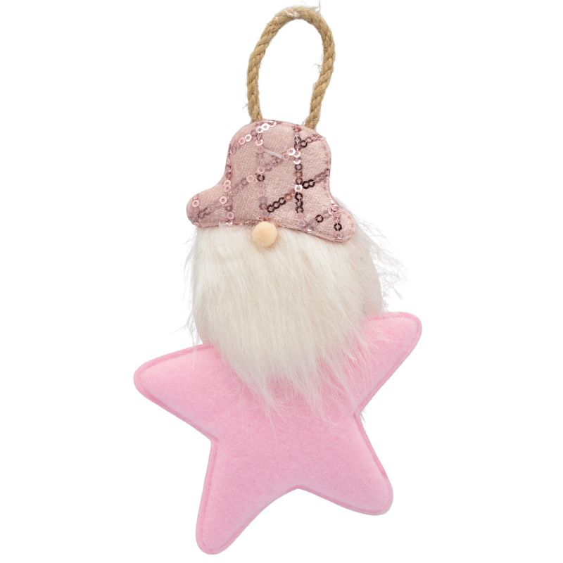 Ornamentul textil în formă de spiriduș, cu dimensiunile de 9.5x15 cm, este o decorațiune adorabilă ce aduce un aer jucăuș și primitor sărbătorilor. Spiridușul are o pălărie decorată cu paiete strălucitoare, o barbă albă pufoasă și o stea roz moale ce îi servește drept corp.