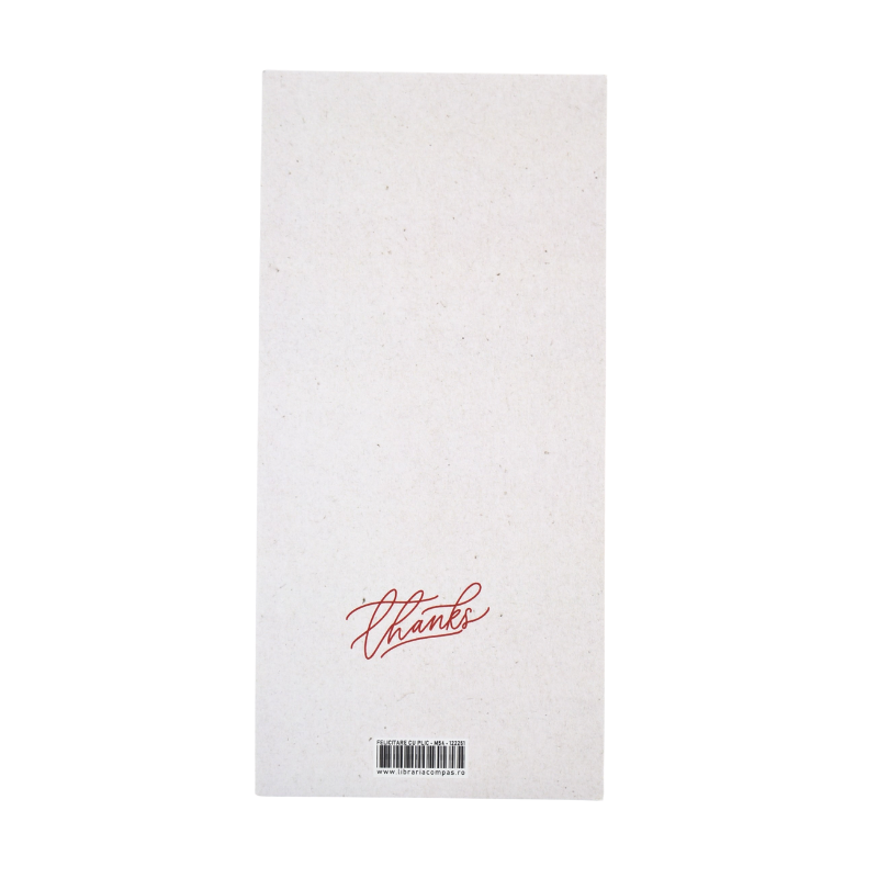 Felicitarea este însoțită de un plic maro elegant, care completează aspectul cald și prietenos. Cu dimensiunea de 105x215 mm, interiorul oferă suficient spațiu pentru un mesaj personal, prin care să transmiți emoția și recunoștința ta.