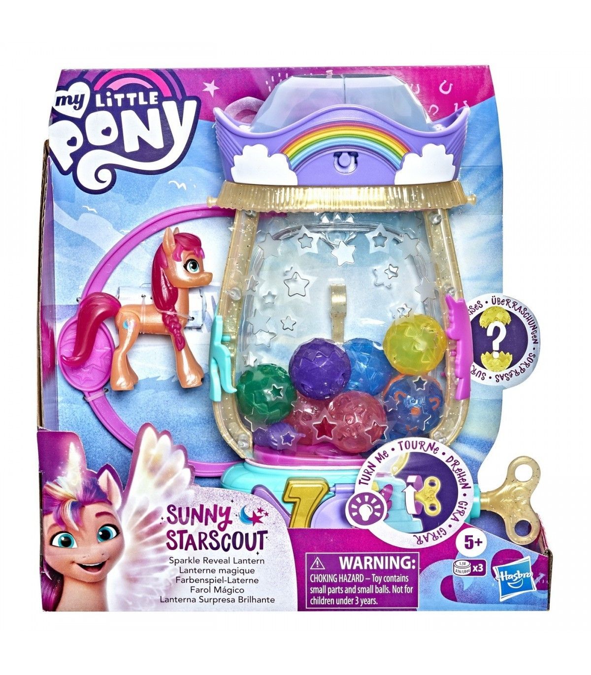 O jucarie de la HASBRO, un ponei mic intr-un set cu lanterna. Datorita felinarului de 30 cm, copiii intorc cheia si descopera 8 recipiente de cristal si diverse surprize. Dezvaluind diverse accesorii, copiii se distreaza personalizand-o pe Sunny Starscout pentru a o transforma dintr-un ponei de pamant intr-un unicorn sclipitor. Doar adaugati un corn stralucitor de unicorn, aripi de pegas si autocolante dragute.