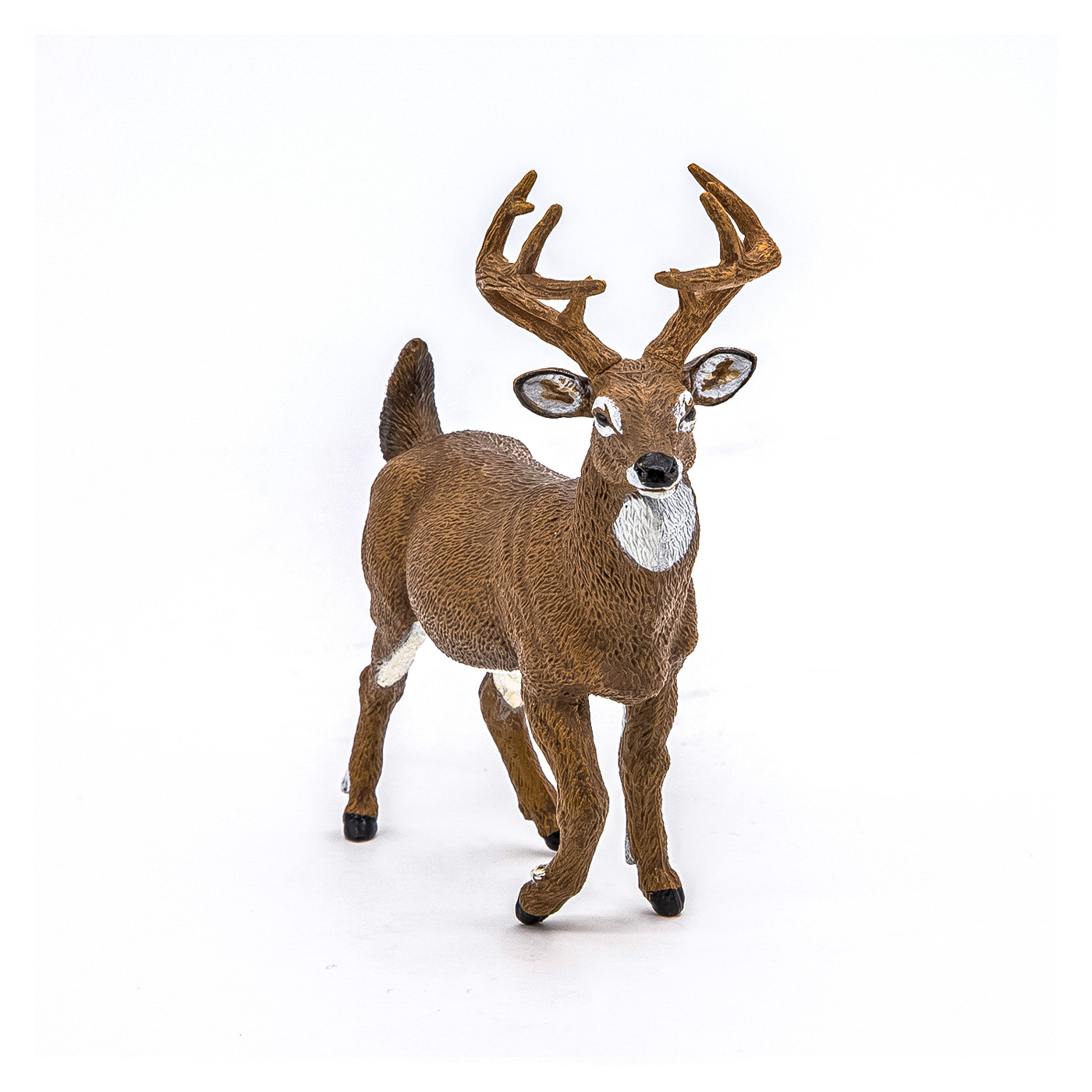Vizitati cerbul cu coada alba maiestuoasa in inima padurilor, explorati savana alaturi de puternicul tigru de Sumatra sau urcati pe varfuri acoperite de zapada pentru a cauta leopardul de zapada. Cerbii cu coada alba sunt mamifere, raspandite predomimant pe teritoriul Americii de Nord si Centrale. Sunt intalnite in special in zone impadurite, putand sa se fereasca de pradatori prin coloritul lor neutru. Cerbii cu coada alba sunt animale sperioase, mereu alerte, acestea isi ridica cozile albe in aer in caz de pericol. Cerbii cu coada alba, sunt vanati pentru coarnele lor, acestea fiind expuse ca trofee valoroase. Produsul are urmatoarele dimensiuni: 10.4 x 4 x 10.9cm si este recomandat copiilor cu varsta peste 3 ani. De mai bine de 20 de ani, Papo inoveaza constant si ii face pe copii din intreaga lume sa viseze cu o gama bogata de peste 600 de produse, reprezentand 12 lumi, animale si personaje. De la modelul original la serie, fiecare dintre figurinele Papo a fost conceputa si creata in Franta pentru a fi fabricata intr-o permanenta preocupare pentru calitate. Pictate manual, atentia la detalii este acum recunoscuta. Figurinele Papo se disting prin acuratete si realism, detaliile sunt de asa natura incat am putea crede ca se vor pune in miscare.