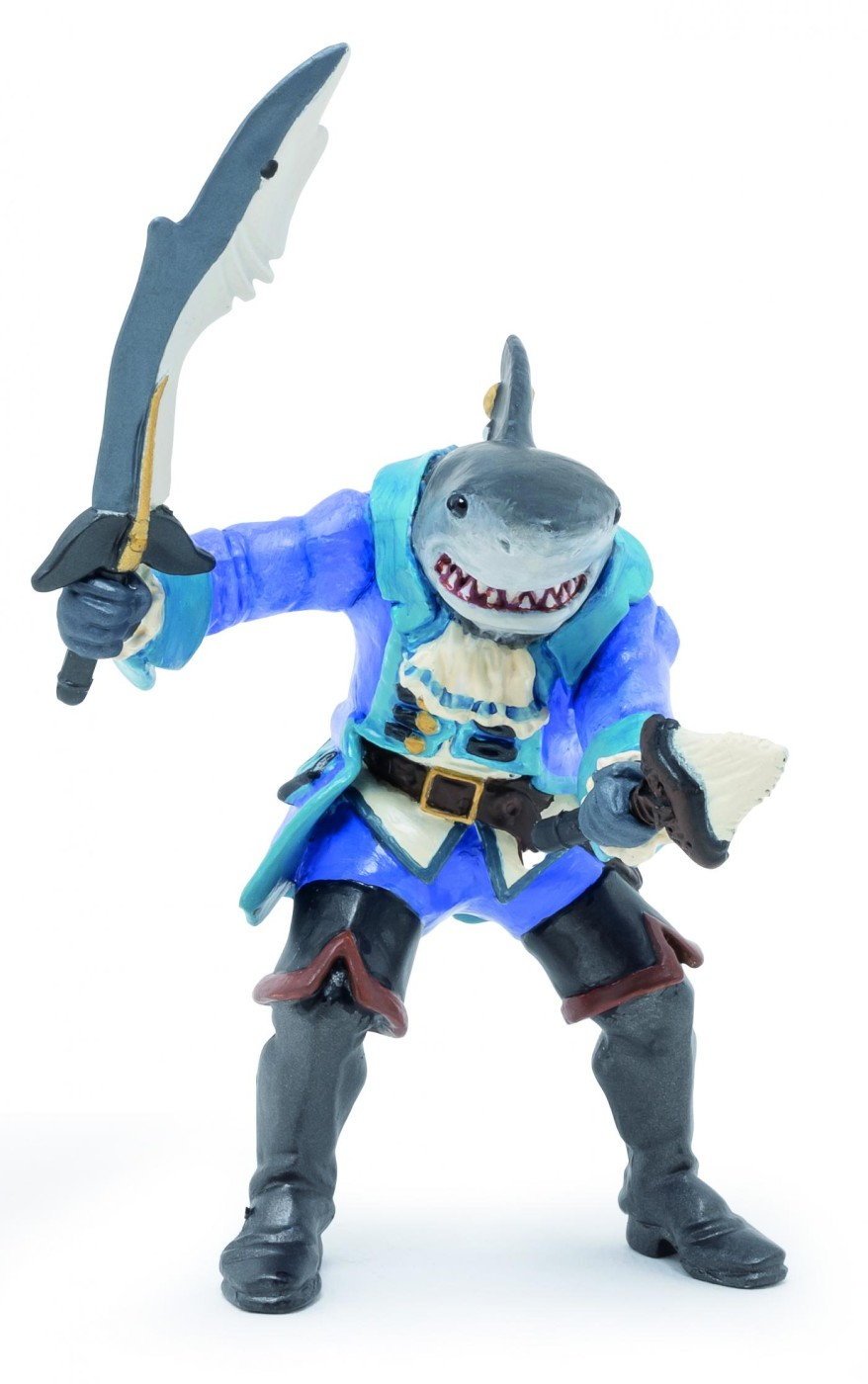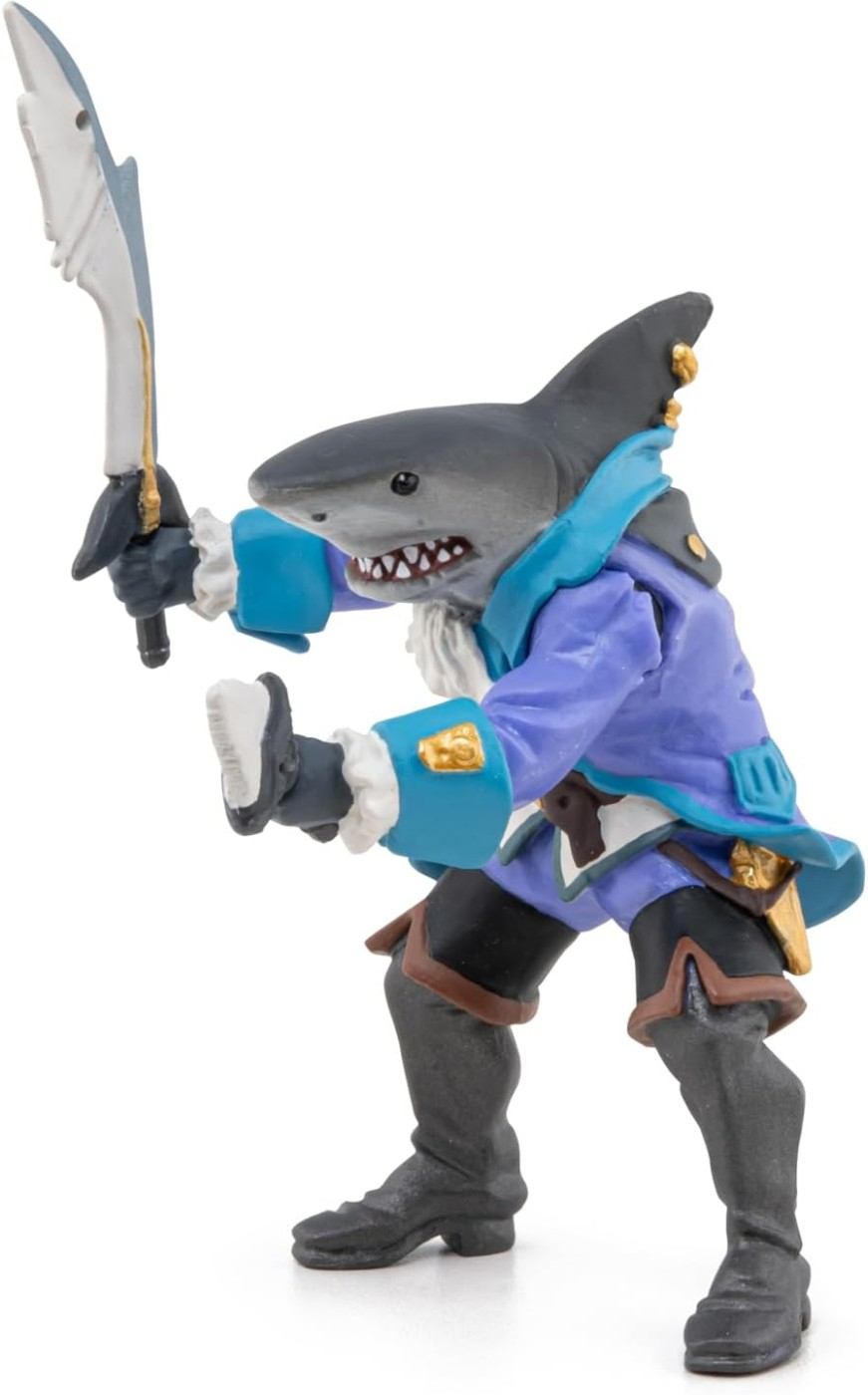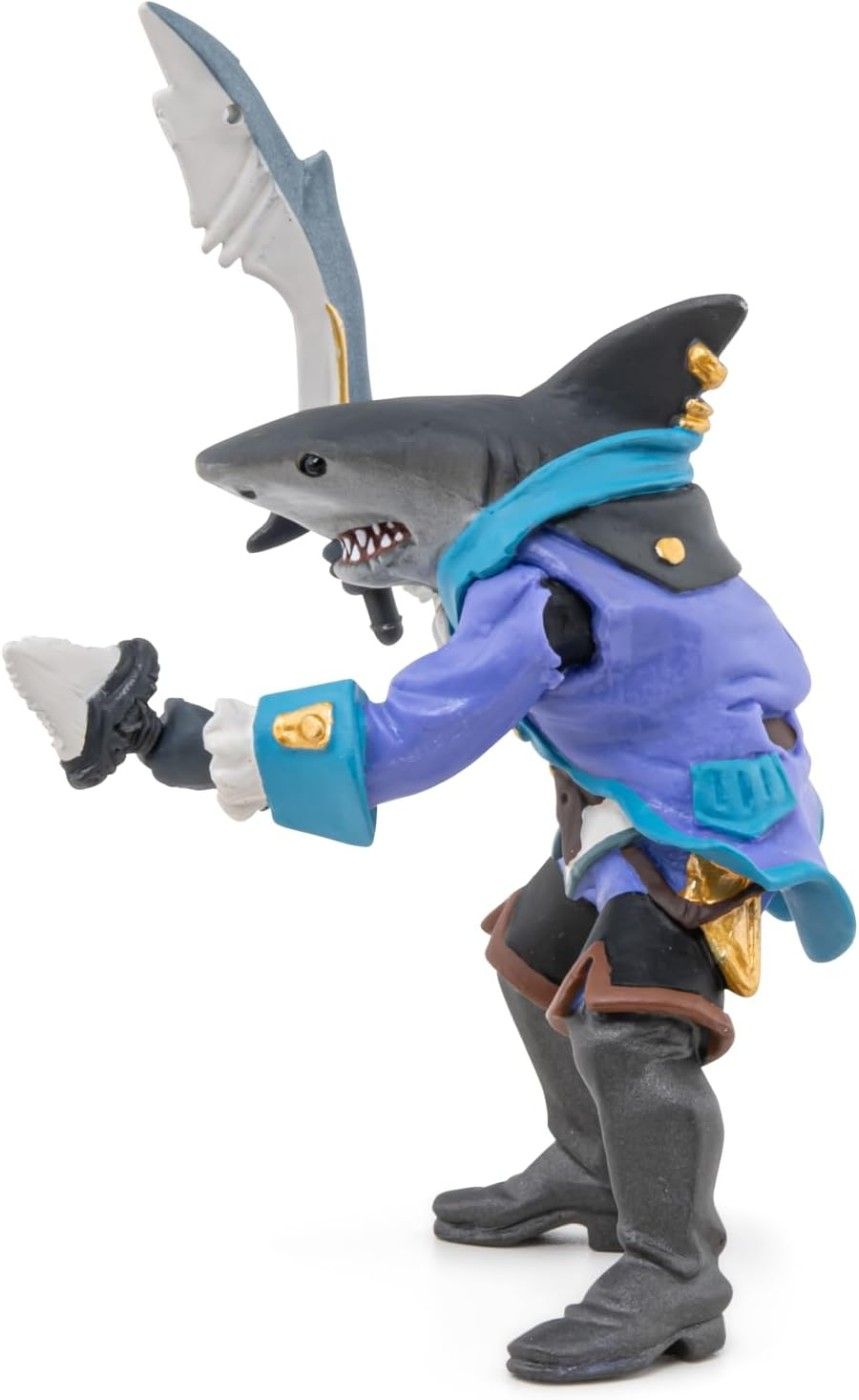 Navigati pe mari in cautarea comorilor pierdute. Rechinul este un pradator oceanic mortal, iar piratul rechin a mostenit toate abilitatile sale. Cu dintii sai ascutiti si cu o viteza uluitoare, nu scapa mare lucru. Produsul are urmatoarele dimensiuni: 7.5 x 8.5 x 11cm si este recomandat copiilor cu varsta peste 3 ani. De mai bine de 20 de ani, Papo inoveaza constant si ii face pe copii din intreaga lume sa viseze cu o gama bogata de peste 600 de produse, reprezentand 12 lumi, animale si personaje. De la modelul original la serie, fiecare dintre figurinele Papo a fost conceputa si creata in Franta pentru a fi fabricata intr-o permanenta preocupare pentru calitate. Pictate manual, atentia la detalii este acum recunoscuta. Figurinele Papo se disting prin acuratete si realism, detaliile sunt de asa natura incat am putea crede ca se vor pune in miscare.