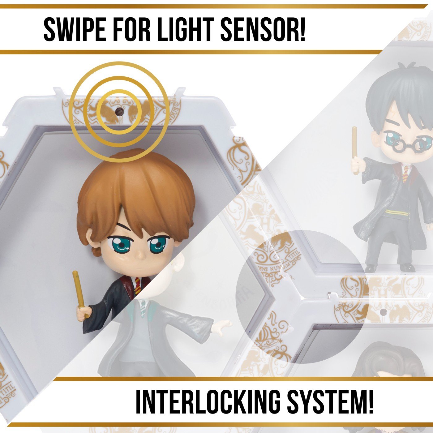 Fiecare personaj este situat in propriul POD in forma de hexagon cu lumini UV si senzor IR incorporat. Pur si simplu miscati mana peste senzor pentru a lumina WOW-ul! POD-ul! Misca-ti mana in fata POD-ului pentru a-l lumina si a dezvalui pictograme ascunse in spatele WOW!Pod-ului! Lumina se stinge automat dupa 30 de secunde. Conectati-le in cateva secunde! Colectia ta poate lua diferite forme si avea in fiecare zi, alt look! Limita e doar de imaginatia ta! Puteti chiar sa va scrieti numele sau initialele pentru a crea un afisaj care este fara indoiala si unic al dvs.! Colectionati si conectati personajele favorite printr-o colectie mai vasta de eroi WOW! PODS! Sunt disponibile personaje : Marvel, DC, Disney, Disney Frozen, Sonic, Jurassic World, Harry Potter, Minionii si altele. Acest pachet contine personajul Ron.