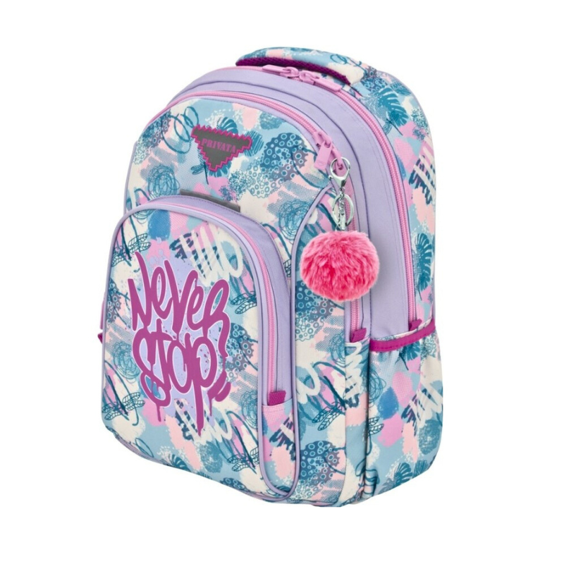 Tandem Never Stop este ghiozdanul perfect pentru fetele care adoră să fie organizate și să iasă în evidență cu un design modern, adaptat stilului urban. Cu dimensiuni generoase, modelul dispune de trei compartimente principale cu fermoar, ideale pentru manuale, caiete, penar sau chiar un laptop subțire. Buzunarul frontal cu fermoar este perfect pentru telefon, chei sau alte obiecte mici, iar cele două buzunare laterale din plasă îți permit să ai mereu la îndemână sticla de apă sau umbrela preferată.