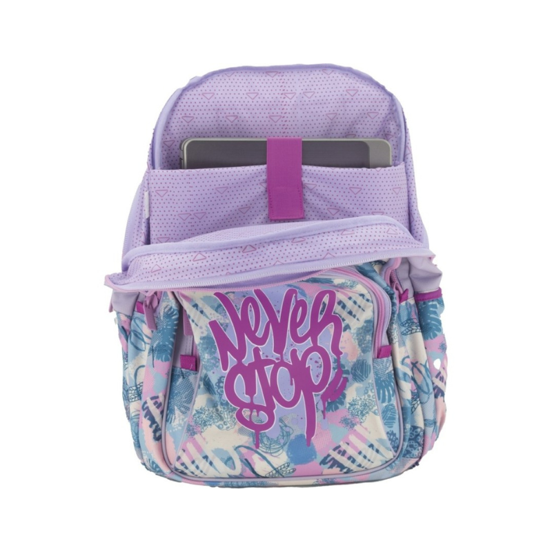 Bretelele anatomice, late și buretate, pot fi ajustate rapid pentru confort personalizat, iar spatele căptușit, prevăzut cu zone de aerisire, reduce oboseala și menține prospețimea chiar și în zilele cele mai încărcate. Materialul exterior este rezistent la uzură și ușor de curățat, protejând tot ceea ce porți cu tine, indiferent de vreme. Designul feminin, cu accente pastel și imprimeuri jucăușe, oferă un plus de energie și originalitate fiecărei zile de școală. Tandem Never Stop este alegerea ideală pentru elevele care își doresc un ghiozdan practic, încăpător și modern, potrivit atât pentru cursuri, cât și pentru activități extrașcolare.