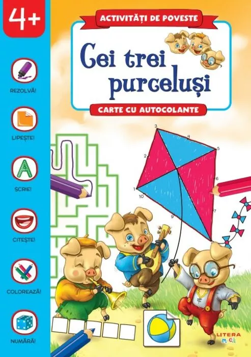 Activități de poveste. Cei trei purceluși este o carte interactivă care combină povestea clasică cu jocuri, exerciții simple și autocolante colorate. Copiii pot completa scene, colora personaje și învăța prin joacă, totul în timp ce redescoperă aventurile celor trei purceluși.