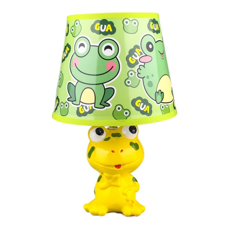 Baza din ceramică, realizată sub forma unei broscuțe simpatice, este completată de un abajur din plastic decorat cu imprimeuri vesele, care filtrează lumina într-un mod blând și confortabil pentru ochi.