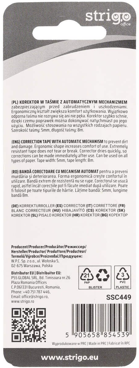 Banda corectoare cu mecanism Strigo este un accesoriu indispensabil pentru școală, birou sau acasă, conceput pentru corectarea eficientă a textelor scrise. Mecanismul tip click asigură o aplicare uniformă a benzii, fără întreruperi sau rupturi, oferind un strat alb opac care acoperă perfect greșelile.